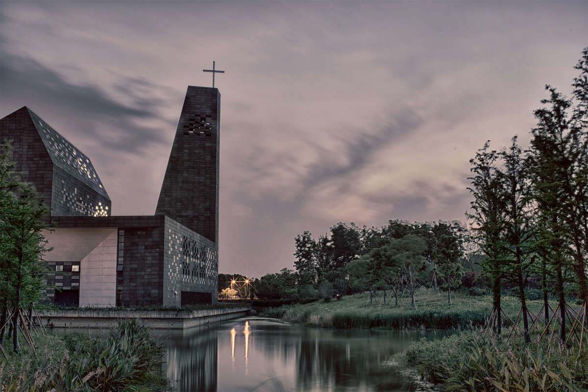 相城基督教堂坐落于阳澄湖西路北侧,虎丘湿地公园大门东,周边三面环水,景观优美,简约的灰底色调使其完美融入了粉墙黛瓦的苏州画卷,雕塑感的造型又恰如其分地突出了时代感。教堂主体采用现代建筑风格,具有时代感,远处可见的颇具雕塑感的造型和高耸的钟塔与湿地公园景观融为一体,营造出以湖水为主体的景观效果。教堂自2011年开始立项,2013年奠基,2015年底建成并开启试运行,占地面积约4亩,总建筑面积5486.15㎡。教堂以三楼主堂和一楼四个小礼拜堂为主体,南北三层建筑结构通过回廊和主体相连,通过时空和光线相搭配营造出宗教氛围,可容纳1200人同时进行礼拜。钟塔高47米,安置有铜钟,可演奏教堂乐曲,亦可和声报时。矗立在钟塔上的十字架高10米,宽5米。相城基督教堂的建成与开放,为相城区广大基督教信徒提供了一处活动场所,增加了相城区的文化内涵,改善了生活环境。同时,也为宗教活动的规范化提供了必要的设施。